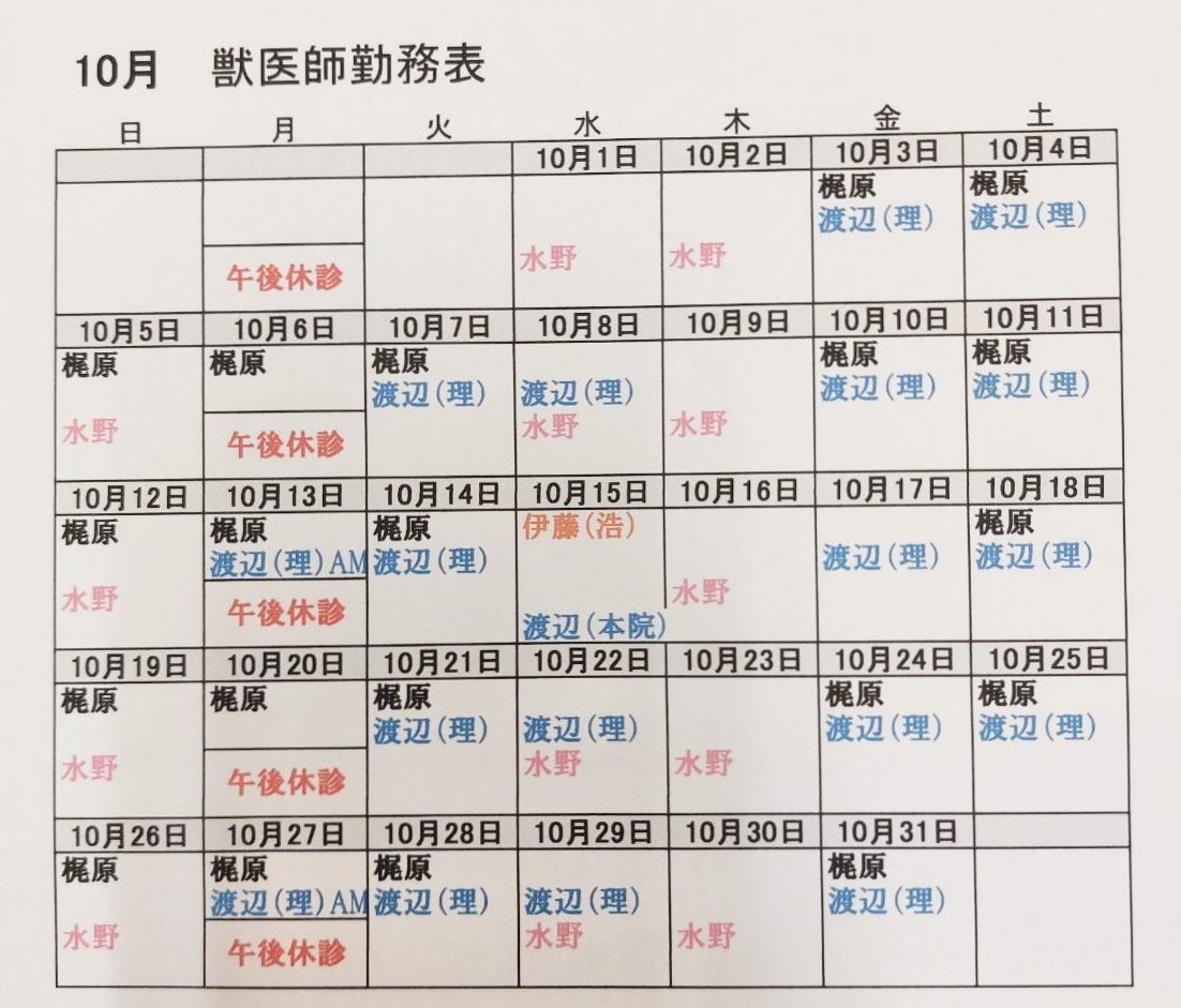 10月 獣医師勤務表|野田市の動物病院なら伊藤動物病院 野田分院へ