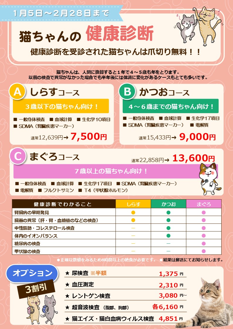 今年も1月5日~2月28日まで、猫ちゃんの健康診断キャンペーンを実施します!
